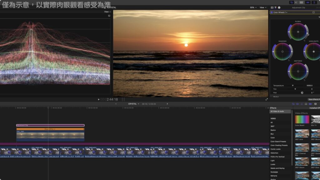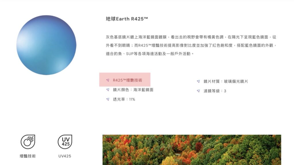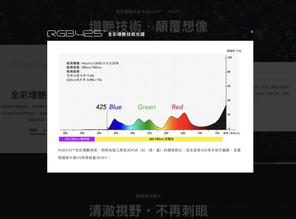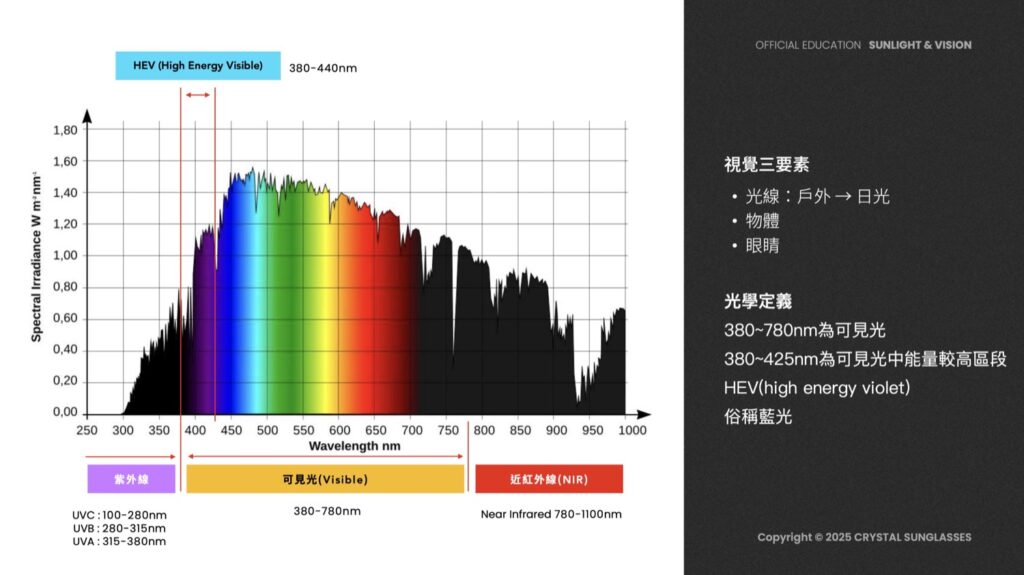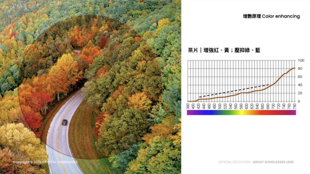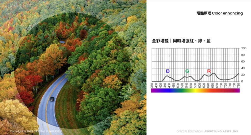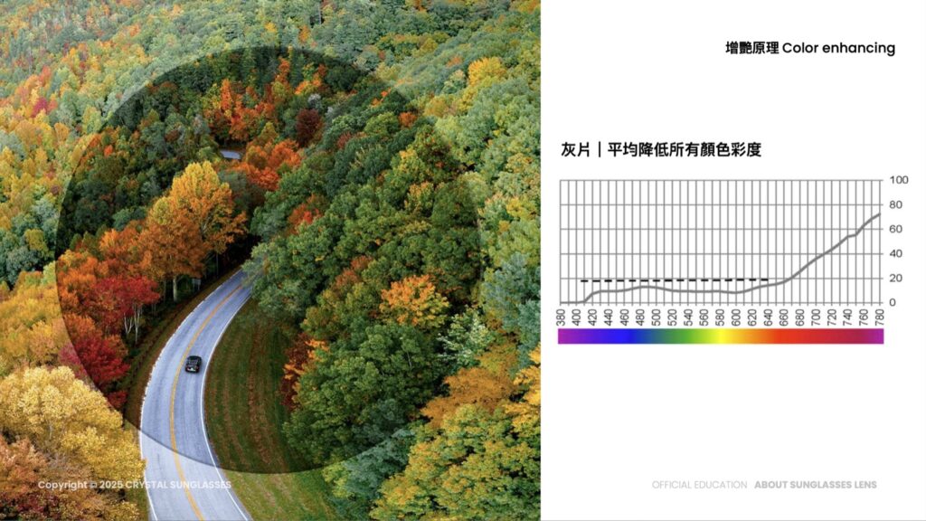 補充一下,剛剛我用影片調色來比喻,其實 CRYSTAL 的增艷原理,是去調整可見光的光譜,來做到降低刺眼陽光對眼睛的傷害和不適,但又能增強色彩飽和度和對比度。