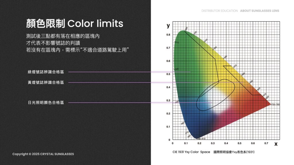 而一副太陽眼鏡是否適合道路駕駛使用,其實也是有規範的,如果你對螢幕、電視或影視行業的色彩空間有研究,對這個圖應該不陌生。