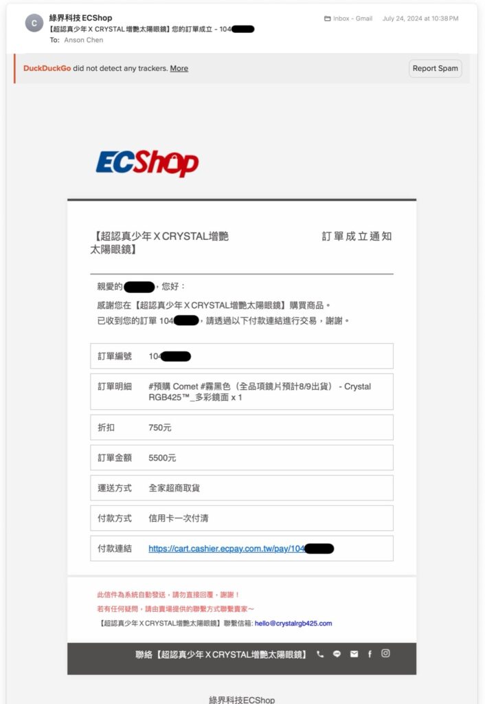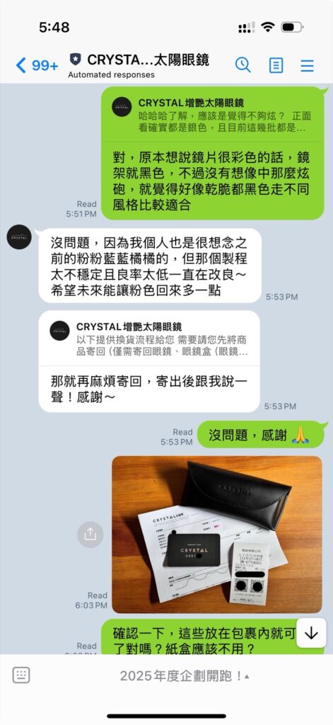 售後服務也是我覺得 CRYSTAL 非常值得讚賞的一點,前面有提到我原本買的款式,其實是多彩鏡面 RGB425 這款,不過我實際收到後,覺得跟想像中有點落差,原本我以為是跟我之前的墨鏡差不多三八的激烈電鍍色,但 CRYSTAL 是相對比較低調一點的⋯⋯我有點不太確定怎麼形容,就是更接近銀色一點。