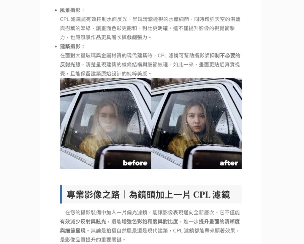 如果你有在攝影、有在玩相機,應該對這個詞比較不陌生,太陽眼鏡上的偏光鏡原理,其實就和拍照的時候,某些情況下我們會加上的「CPL」是一樣的原理。